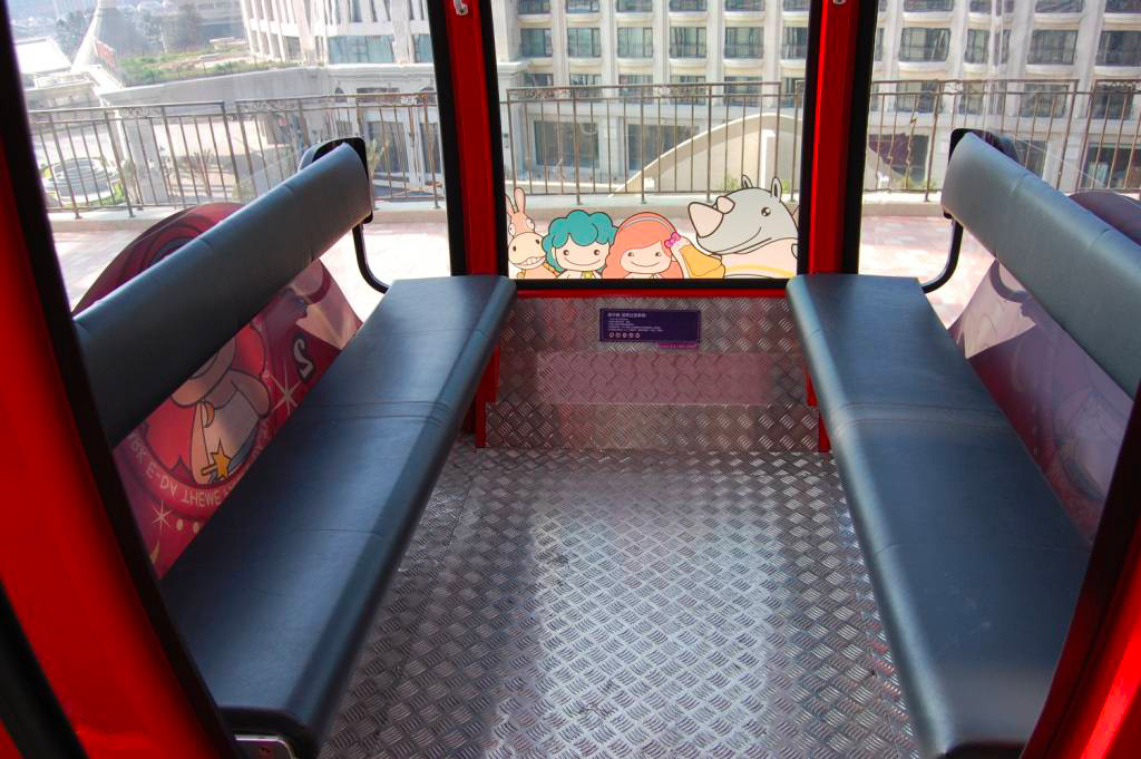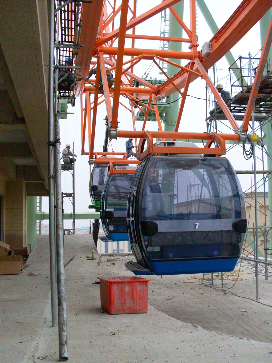 All Cabins or Vehicles are designed to seat 8 guests maximum. Main columns are round shaped, the rotating structure contains less spokes (two vehicles each spoke), thus increasing the wind resistance.
